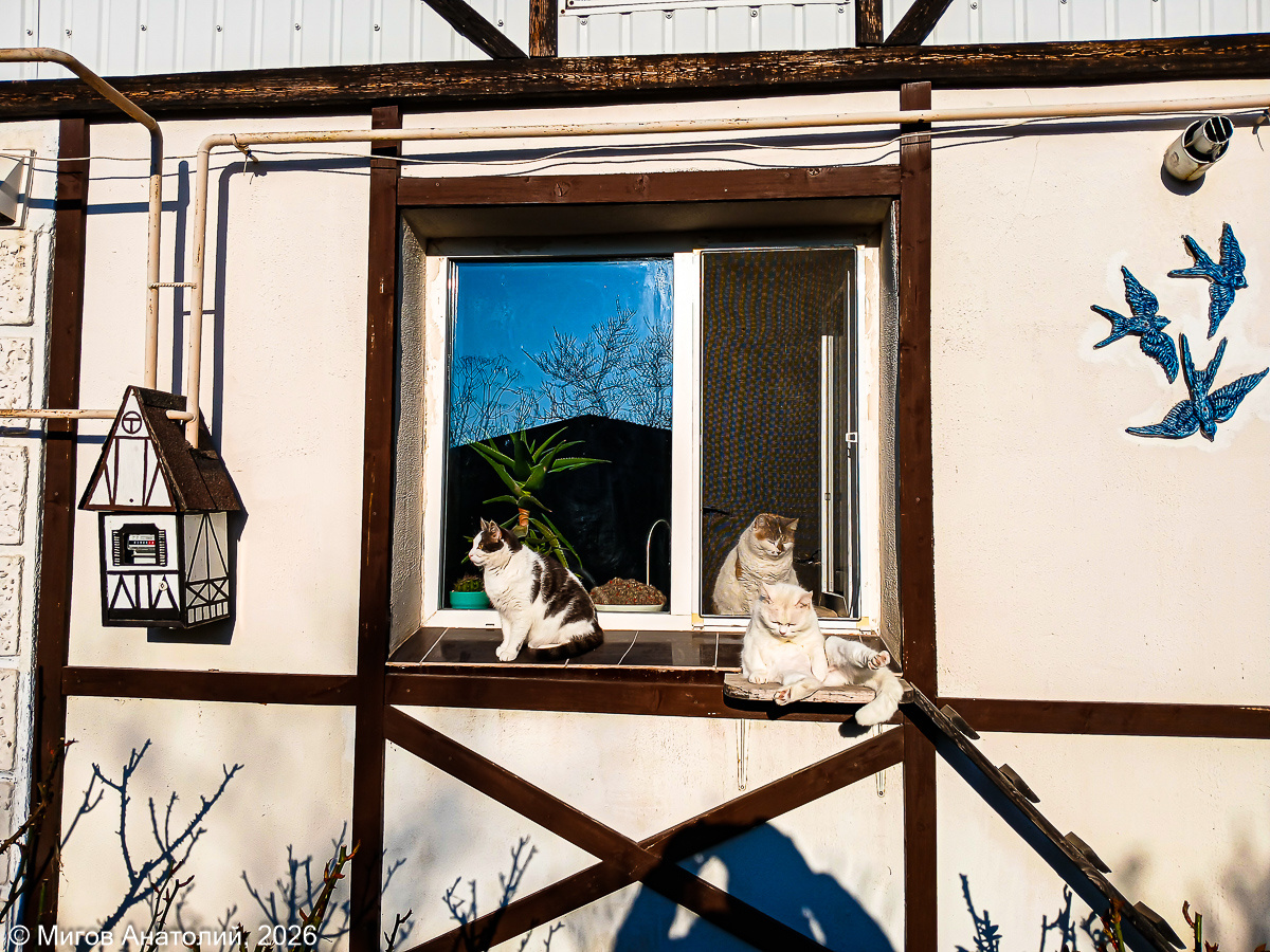 Все наши три кошки вышли, погреться на солнце. Маруся заняла лучшее место на смотровой площадке. Мамаша Че с Кокошкой устроились где придётся. Сразу вспомнился замечательный советский фильм "Республика ШКИД" с предвыборной речью Цыгана: - Старшему отделению - горбушки! Младшему..., тоже по-справедливости. Мы тем временем садимся завтракать на открытой террасе. Утро тёплое, в меру солнечное, ветра нет, в общем, красота. Кошки, несмотря на то, что сами успели уже получить и первый, и второй завтраки, всё же не были бы против того, чтобы пристроиться поближе к нашему столу. Однако разумно решили, что лучше будет держаться на безопасном расстоянии. Потому что дружелюбное отношение к ним нашей корги Тильды настолько не распространяется. Стол - это для неё святое. Не то что попробовать, но даже и посмотреть, никому кроме Тильды непозволительно. Стол наш, кстати, особого чувства зависти сегодня не представляет ни для собачки, ни для, тем более, кошек. Хотя для нас с Леной он, можно сказать,