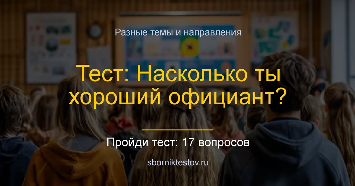 ? Ресторанный сервис - это искусство создания незабываемого впечатления для каждого гостя. Профессиональный официант должен владеть не только базовыми навыками обслуживания, но и понимать психологию гостеприимства, знать стандарты ресторанного этикета и уметь работать в команде. От качества сервиса... 17 вопросов · Тест на знания Уже прошли: 872 человека ▶️ Пройти в Телеграм ▶️ Пройти в MAX 🌐 Пройти на сайте СборникТестов