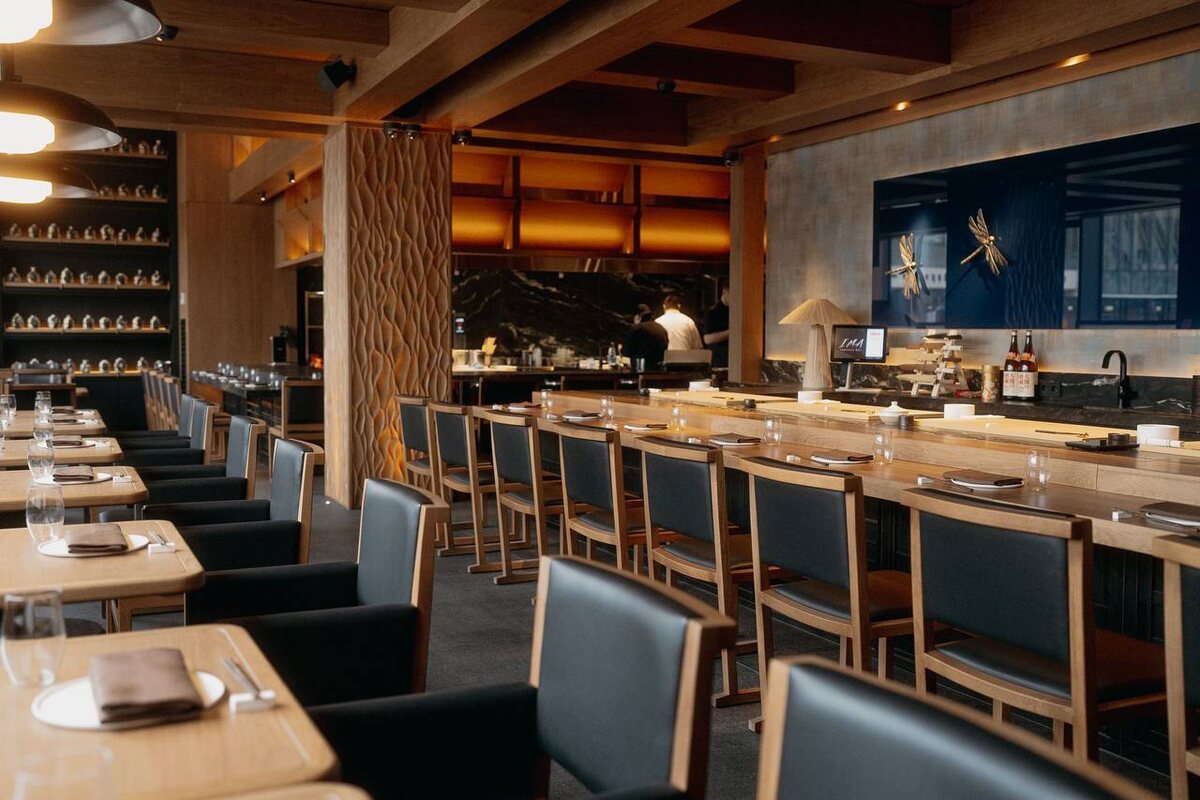 Название переводится как «сейчас» — это философия места: остановиться, не спешить и сосредоточиться на еде. А за кухню отвечает Такуми Вада-сан — шеф с 30-летним стажем, готовивший для наследного принца ОАЭ. Его принцип: качественный продукт, правильная температура и чистый вкус. Ключевые ингредиенты (тунец, васаби, рис, водоросли комбу) привозят из Японии, сезонные — от российских поставщиков. В меню: нигири-суши от 490 ₽ (тунец, краб, лосось, гребешок), закуски (татаки из тунца, кушияки, эдамаме с трюфелем), суп добинмуси с морепродуктами (1900 ₽), кинки ницуке (5500 ₽) — рыба в соевом соусе и саке, рис унадзю с угрём (1600 ₽), десерты. Теппан-зона на 5 гостей: мастер готовит прямо перед вами. Бар: 37 видов саке, винная карта на 250 позиций (акцент на белые и шампанские), авторские коктейли (Miso Old Fashioned, Silent Sakura). Интерьер — отдельная история. Камень (вечность) и цветы (миг). Решетчатые панели в духе храмов, керамика в технике раку, золотой карп как символ быстротечн