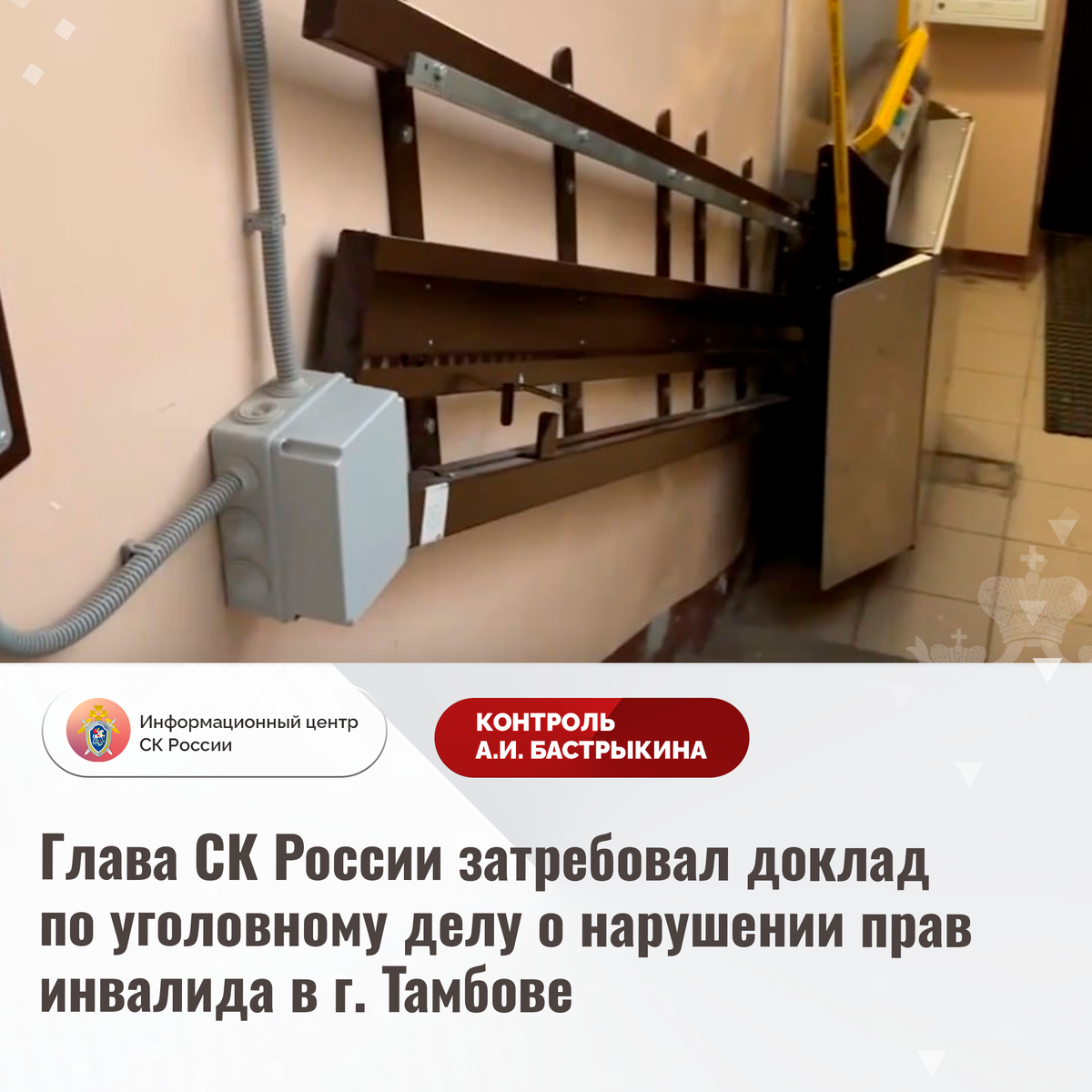Глава СК России затребовал доклад по уголовному делу о нарушении прав инвалида в г. Тамбове В сети Интернет сообщается о нарушении прав инвалида-колясочника из города Тамбова на доступную среду. Женщина проживает в многоквартирном доме на улице Советской, в котором в 2024 году установлен электроподъемник. Однако до настоящего времени устройство не введено в эксплуатацию. В связи с этим она лишена возможности покинуть жилое помещение без помощи третьих лиц. Обращения в компетентные органы результатов не принесли. В СУ СК России по Тамбовской области возбуждено уголовное дело. Председатель Следственного комитета Российской Федерации Александр Иванович Бастрыкин затребовал у и.о. руководителя СУ СК России по Тамбовской области Андрея Николаевича Чапанова доклад о ходе и результатах расследования уголовного дела с учетом озвученных в публичном пространстве доводов. Исполнение поручения поставлено на контроль в центральном аппарате ведомства. #СледственныйКомитет #СКРоссии #СК #ИЦСКР #Инфо