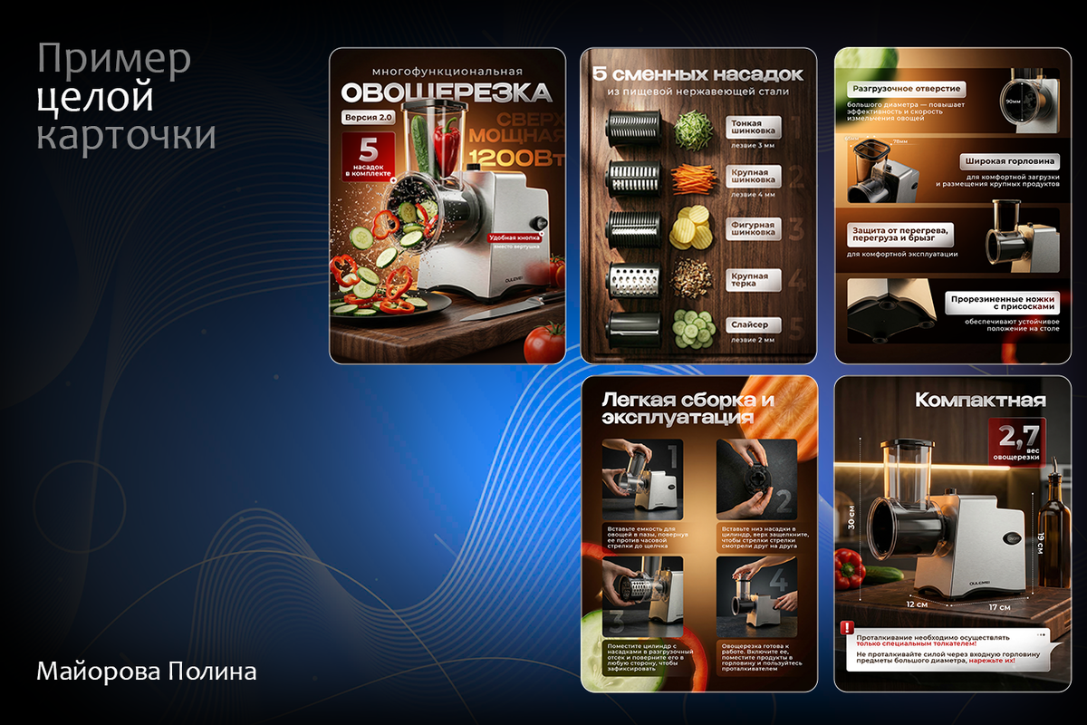 Атмосфера и визуал: Мне хотелось передать теплый вайб современной, дорогой кухни. Для этого я использовала глубокие шоколадные и древесные оттенки с контровым «вечерним» светом. В таком окружении корпус из стали выглядит максимально премиально и надежно, а яркие цвета свежих овощей создают сочный контраст✨ Что по дизайну: На обложке добавила летящие слайсы овощей и брызги воды. Это не просто цепляет взгляд, но и визуально подтверждает сверхмощность — гаджет режет быстро и сочно! Информация разбита на понятные блоки. Слайд с насадками стилизовала под аккуратную раскладку на деревянной доске — сразу видно, какой формы получится нарезка Сделала пошаговую инструкцию по сборке с фокусом на руки и детали, а также вписала габариты устройства прямо в интерьер, чтобы покупатель мог визуально «примерить» его на своей столешнице Получилось стильно, информативно и очень «вкусно» Нужен рабочий дизайн? Нажми на ссылку ниже, чтобы узнать подробности @designer_polinamayorova