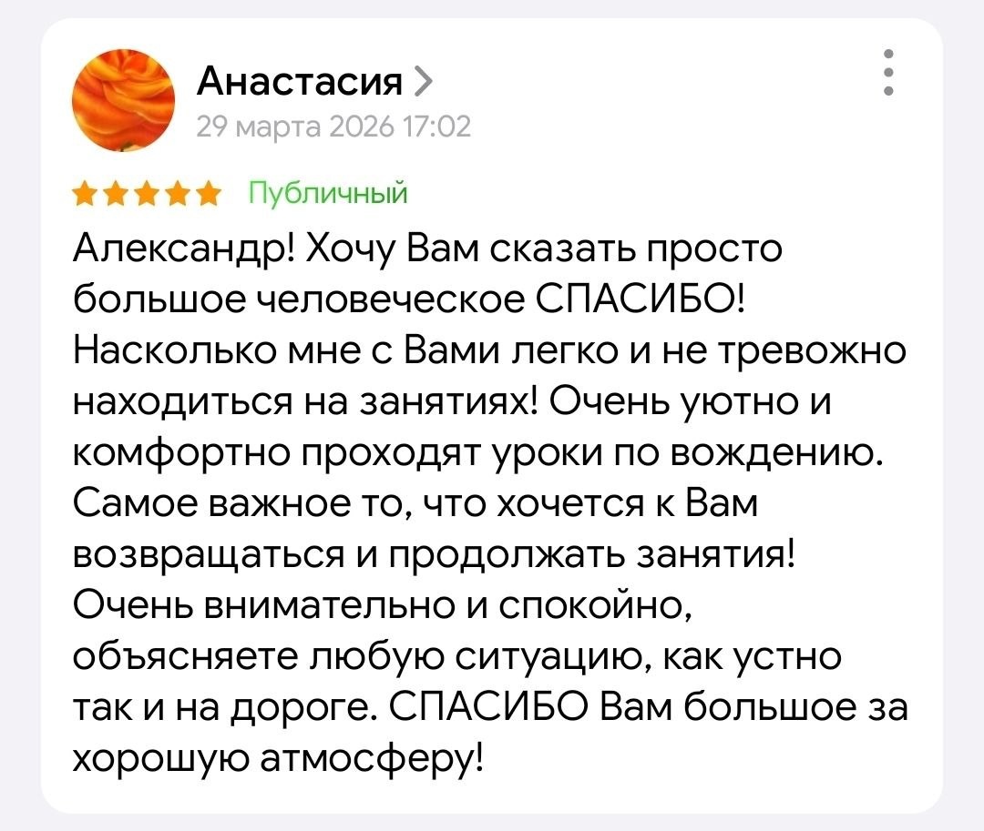 без стресса: легко, уютно, с четкими объяснениями на дороге, и желание возвращаться растёт само собой! Это работает для учеников автошкол и тех, кто давно не водил. 🚗 Хотите такой же эффект? Запишитесь онлайн: dikidi.net/1829681 — места ещё есть! 😊 🟣Сообщество вконтакте 🟣Канал в Max