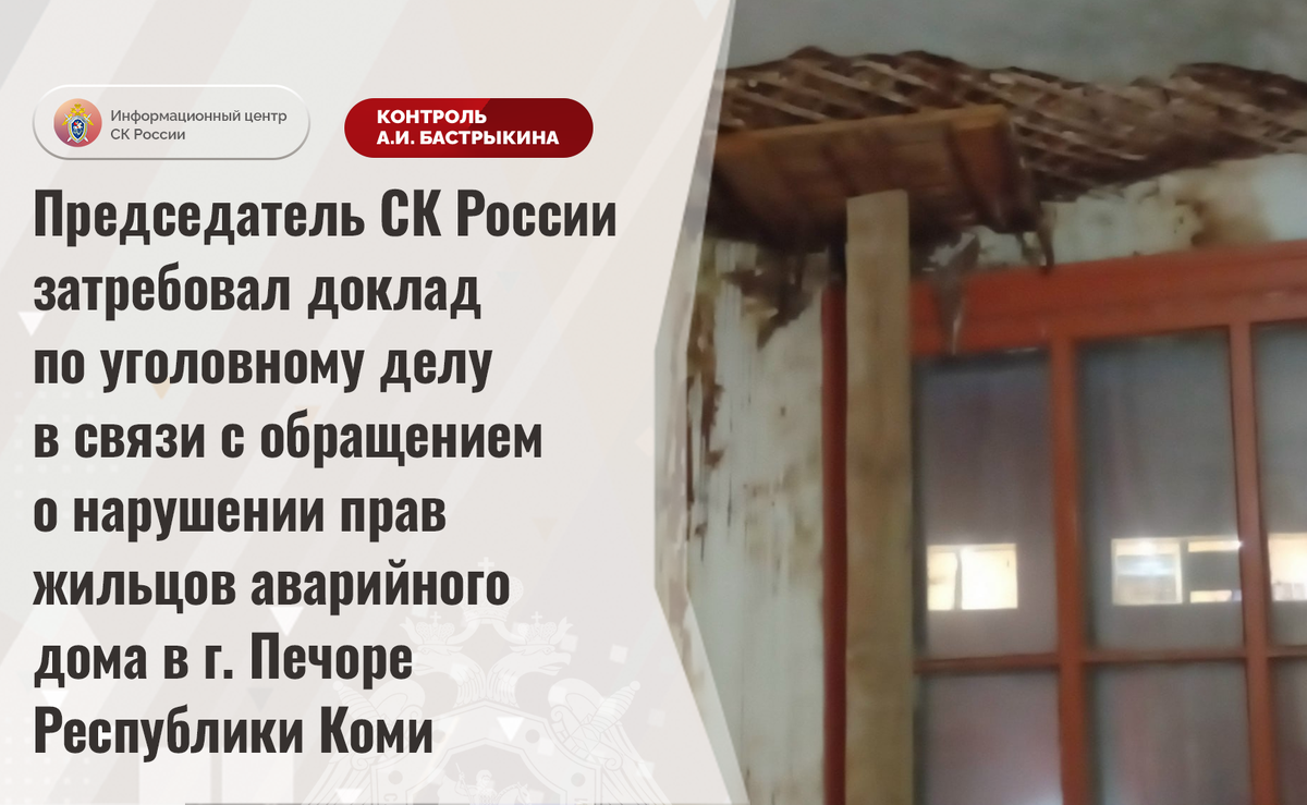 Председатель СК России затребовал доклад по уголовному делу в связи с обращением о нарушении прав жильцов аварийного дома в г. Печоре Республики Коми К Председателю СК России А.И. Бастрыкину через Информационный центр поступило обращение по вопросу длительного нерасселения жильцов многоквартирного дома на улице Московской в городе Печоре Республики Коми. На протяжении длительного времени здание 1947 года постройки находится в непригодном состоянии: фундамент и несущие конструкции деформированы, потолочные перекрытия разрушаются, кровля протекает, инженерные коммуникации изношены. В 2017 году строение ввиду высокой степени физического износа признано аварийным, однако до настоящего времени благоустроенное жилье гражданам не предоставлено, срок расселения с 2021 года перенесен на 2030 год. Обращения в уполномоченные органы результатов не принесли. В СУ СК России по Республике Коми возбуждено уголовное дело. Председатель Следственного комитета Российской Федерации Александр Иванович Баст