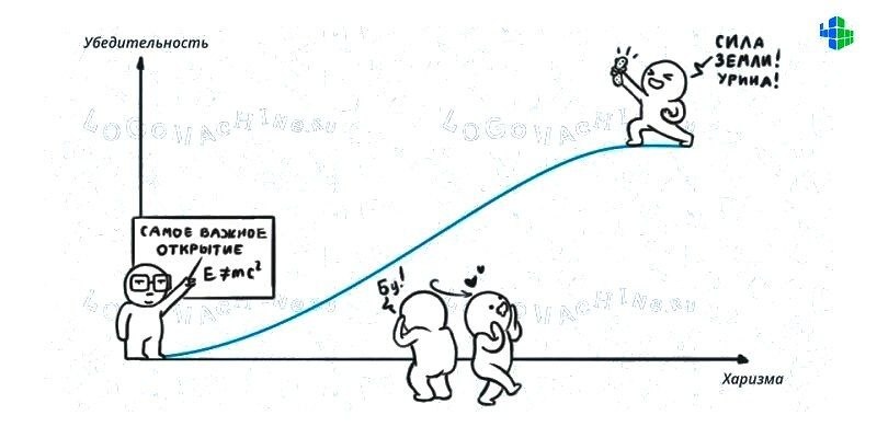 Схема на изображении показывает главную идею: убедительность складывается из двух компонентов — харизмы и демонстрации уверенности («силы»). Формула на доске может быть абсурдной, но если её произносит человек с горящим взглядом, мы склонны верить.