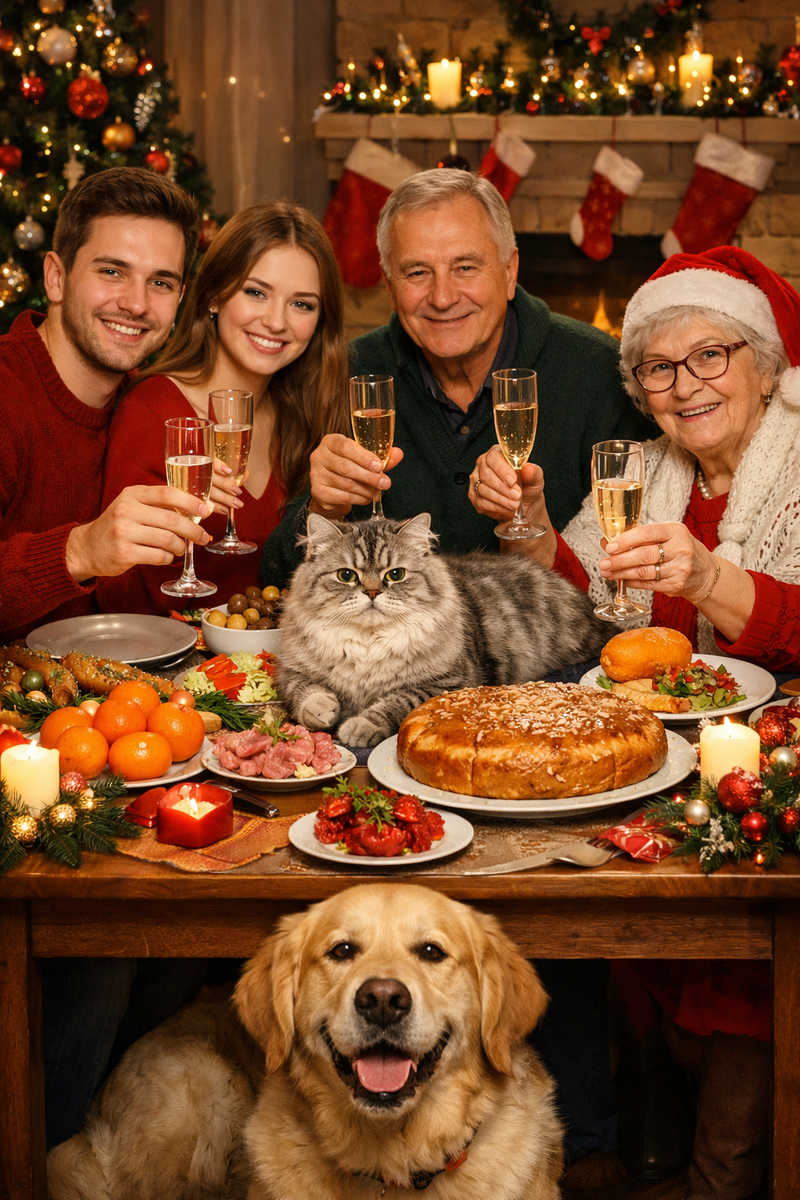 Маруся смотрела на бокалы с кошачьим достоинством, словно была выше этих человеческих ритуалов, но присутствовала из уважения. За окном гремели первые салюты, нетерпеливо и рано. Снег за стеклом вспыхивал красным и зелёным.