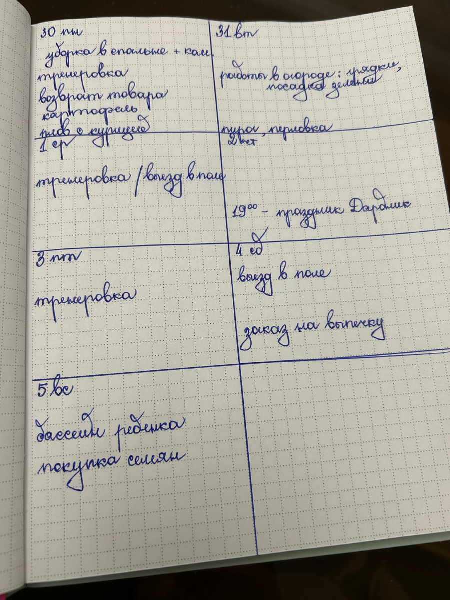 Я люблю планирование. Всегда планирую дела и покупки на год, месяц, неделю и день. Мне так проще. Утром встаешь, уже не думаешь, с чего начать дела, что готовить сегодня, не упускаешь важное. В воскресенье вечером я сажусь за ежедневник. Мне удобно просто делить тетрадный лист на количество дней в неделе. В каждую ячейку с соответствующим днем я записываю самые важные дела и что собиралась приготовить. Более мелкие дела я расписываю отдельно каждый вечер на следующий день.