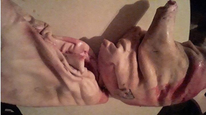 Ну не хотел поросёнок расти думал наверно для красоты мы его растим. Вот бывает иногда покупают люди карликовых поросят и держут как домашнее животное, а он у них выростает до необъятных размеров, а у нас наоборот надо было до необъятных размеров, а он не рос, только пузо одно ну мы и решили его на мясо пустить. Когда муж занес мясцо домой я аж засмеялась, да говорю не на долго нам хватит, вот мясо обрежу сделаю фарш, косточки на суп и кончится он у нас уже к новому году, так что готовь через месяцок ещё одну свинку, а получается даже двух, ведь одну уже давно задумали коптить отвезти полностью . Вот такого огромного поросёнка муж забил на мясо для дома . ))))) Ну конечно я не расстроилась, мясо оно и в африке мясо, а тут ещё своё собственное, не покупать, не тратится . Голова поросёнка поместилась в кастрюле такой он был не большой. Я всегда когда забиваем свинку готовлю вкусный холодец из головы . Добавляю всякой приправы и варю пока мясо не начнёт отделятся от кости . Отделила от ко