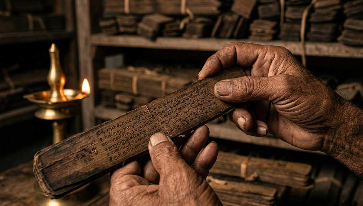 В штате Тамилнад скрыты архивы, которые физически не должны существовать в нашей реальности. Это настоящие библиотеки судеб. На деревянных стеллажах покоятся миллионы узких растительных табличек, испещренных древнетамильским письмом.