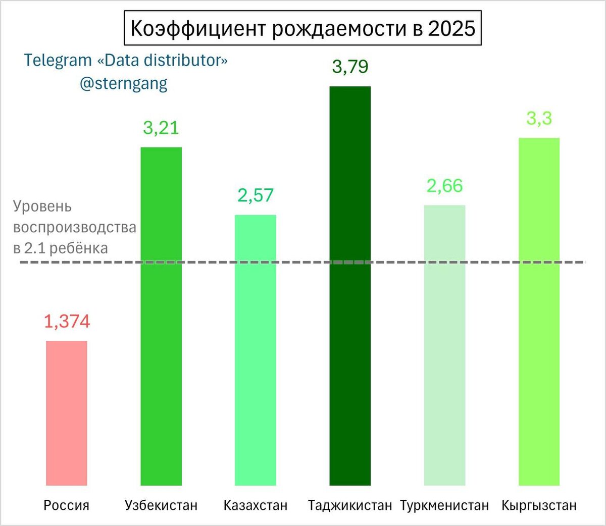 Насколько СКР стран Центральной Азии выше уровня России: 🇰🇿 Казахстан: 1.87 раза (+87 %) 🇹🇲 Туркменистан: 1.94 раза (+94 %) 🇺🇿 Узбекистан: 2.34 раза (+134 %) 🇰🇬 Кыргызстан: 2.40 раза (+140 %) 🇹🇯 Таджикистан: 2.76 раза (+176 %) СКР этих стран превышает показатели России в 1.87-2.76 раза В Центральной Азии родилось на 50 % больше детей, чем в России — за 2018-2025 гг. превышение достигло 3.700.000 В 1950 году в центральноазиатских республиках родилось 595.734 ребёнка В РФСФР за тот же период показатель составил 2.859.000 — на 380 % больше Уже в 1987 году это было 1.600.000 и 2.500.000, соответственно; за полтора поколения рост числа родившихся в Центральной Азии составил почти 170 % Первое за многие века превышение числа родившихся в Средней Азии в сравнении с Россией произошло в 1993, повторилось в 1995 однако стало устойчивой и постоянной тенденцией с 2018 (тогда родилось 1.600.000 в РФ и 1.722.000 в ЦА) В 2025 голу в Центральной Азии родилось 1.760.967 детей против 1.1