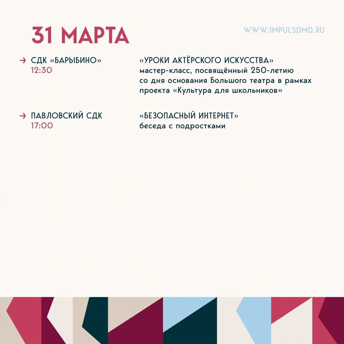 ✨ 💬 «Культура для каждого, от детства до вечера.» Дома культуры городского округа Домодедово приглашают всех на свои мероприятия! Скорее смотри, что ждёт тебя в период с 30 марта по 5 апреля!🤩🌸 ✅ Мероприятия Домодедово https://dzen.ru/id/66f10385cc4c5a16f7b5fb02 https://vk.ru/domodedovo_events http://dzen.ru/domodedovo_events