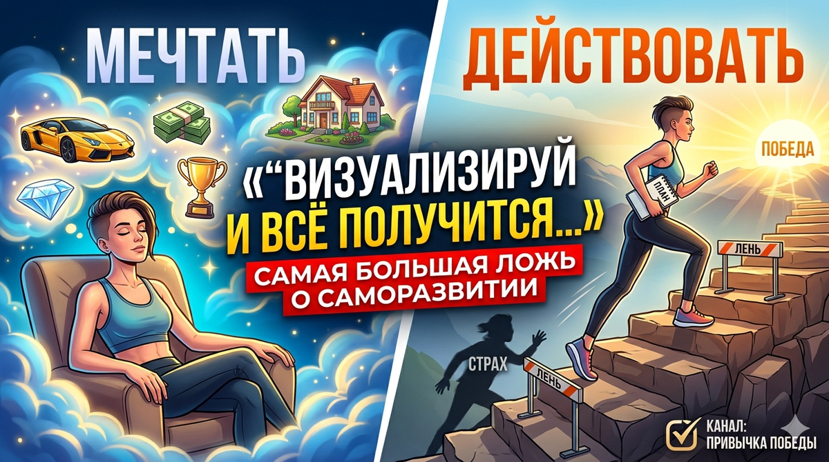 Нас десятилетиями учили: «Представь успех, почувствуй его вкус, и Вселенная сама даст тебе всё необходимое». Карты желаний, аффирмации перед зеркалом, мечты о дорогой машине... У меня для вас плохая новость: это не просто не работает, это мешает вам побеждать. Давайте разберемся, почему ваш мозг играет против вас, когда вы мечтаете, и что нужно делать на самом деле. Когда вы ярко и в красках представляете себе достигнутую цель (например, как вы стоите на сцене или покупаете новый дом), ваш мозг совершает фатальную ошибку. Он путает фантазию с реальностью. В этот момент уровень стресса падает, пульс замедляется, и выделяется дофамин — гормон удовольствия. Мозг считает: «О, мы уже победили! Цель достигнута, можно расслабиться». В итоге энергия на реальные действия (труд, звонки, обучение) просто исчезает. Вы попадаете в «дофаминовую яму» мечтателя. Профессор психологии Габриэль Эттинген доказала: чтобы побеждать, нужно не просто мечтать, а практиковать «ментальный контраст». Она разработ