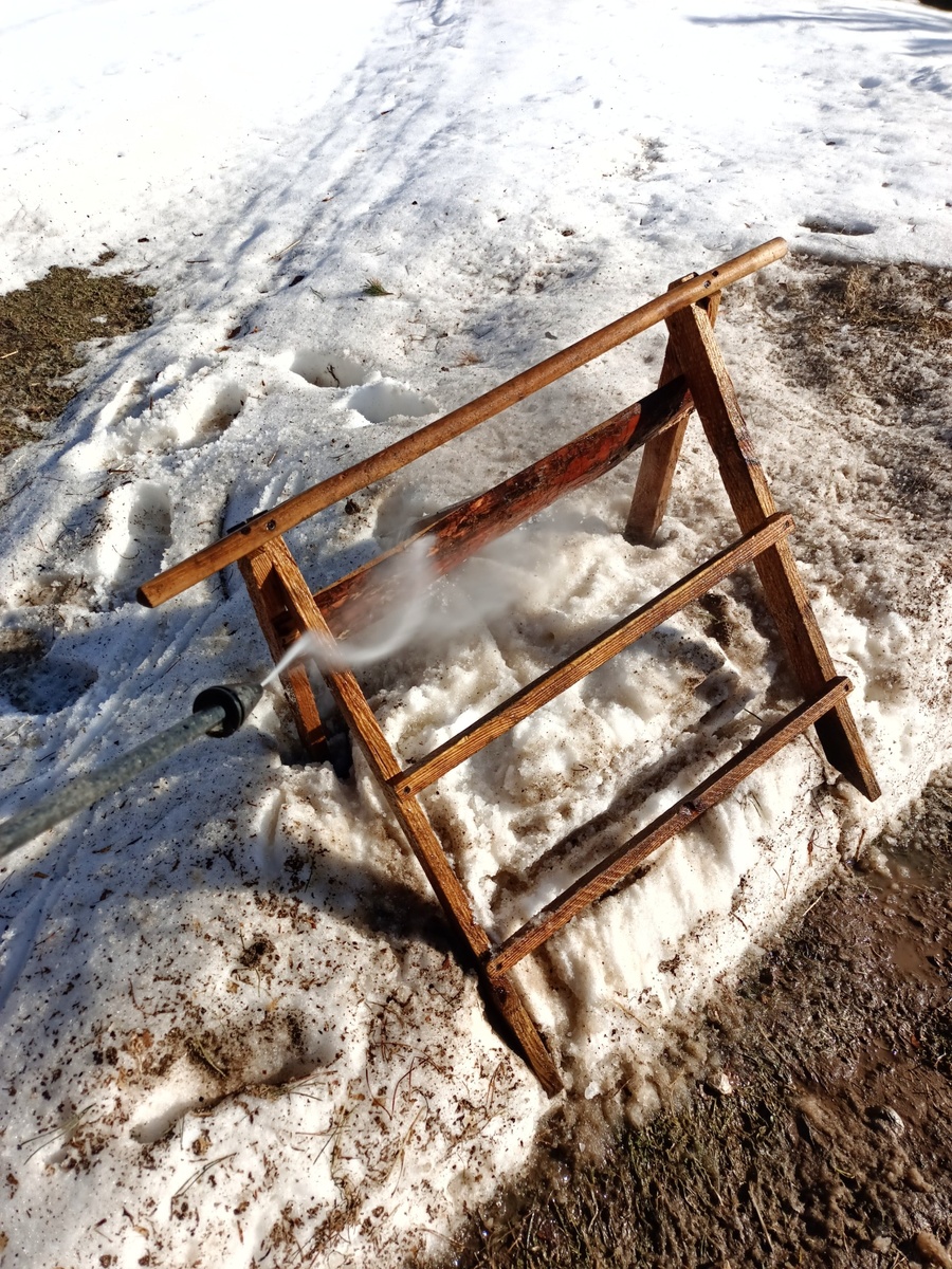 Водные процедуры сегодня идут на ура. Всякие конструкции отмываю. Загон зимний продолжаю очищать. Вчера вывез треть. Сегодня ещё треть. И на завтра осталось.