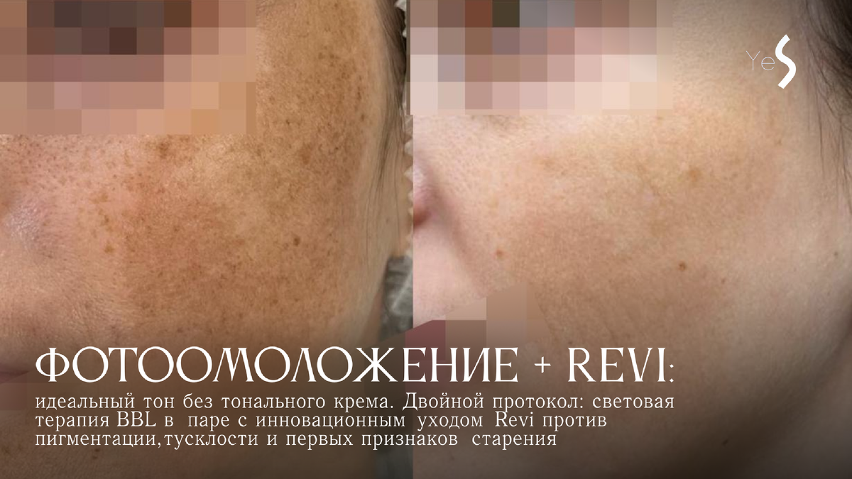 Фотоомоложение + Revi: идеальный тон без тонального крема. Двойной протокол: световая терапия BBL в паре с инновационным уходом Reviпротив пигментации, тусклости и первых признаков старения.