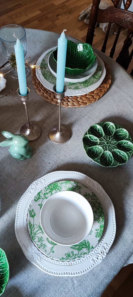 Мне нравится сочетать эти салатники с тарелками, которые покупала тоже в Фикс прайс ,но ранее. Их цветочный принт в зелёных тонах добавляет весенней свежести и акцент.