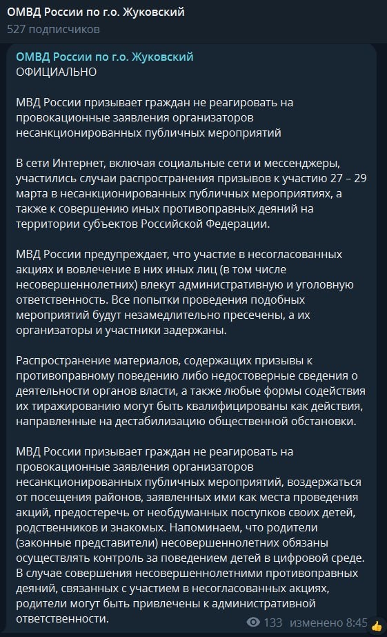 Полиция Жуковского и МВД России предупреждают в Telegram о недопустимости участия в несанкционированных мероприятиях в защиту Telegram.