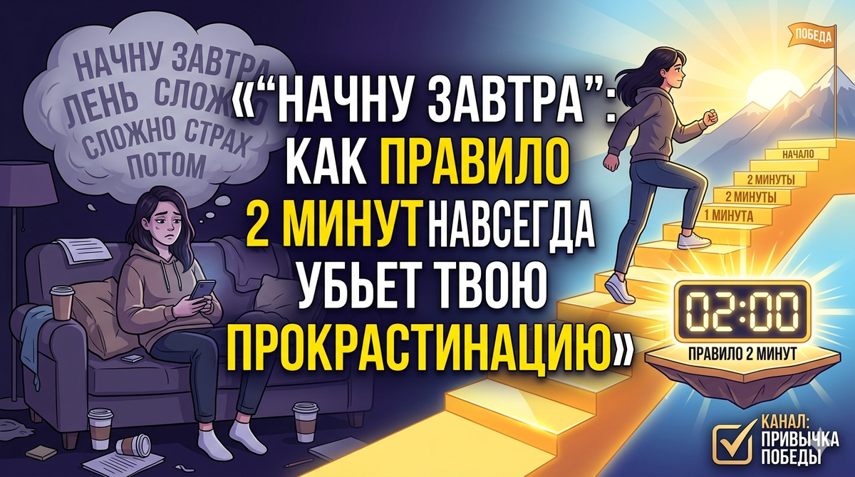 Давайте честно: самое сложное в любом деле — это начать. Вспомните тот отчет, который вы откладываете неделю. Или спортзал, в который собираетесь с понедельника. Проблема не в том, что задача сложная или скучная. Проблема в том, что ваш мозг, оглядываясь на весь объем предстоящей работы (написать 20 страниц, тренироваться час до седьмого пота), включает режим самосохранения и шепчет: «Давай не сегодня. Сейчас мы слишком устали, да и кофе не допито». Прокрастинация — это не лень. Это страх перед масштабом действия. В физике есть понятие инерции: покоящееся тело стремится оставаться в покое, а движущееся тело стремится продолжать движение. То же самое работает и в нашей психологии. Самое трудное — сдвинуть себя с мертвой точки. Чтобы преодолеть это сопротивление, вам нужно сделать действие настолько маленьким, что мозг просто не сможет сказать «нет». Правило 2 минут гласит: Если вы хотите внедрить новую привычку или начать сложное дело, упростите его до действия, которое занимает меньше