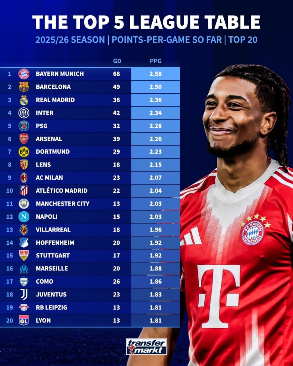 Топ-20 клубов топ-5 чемпионатов Европы по среднему количеству очков за матч в сезоне 2025/26