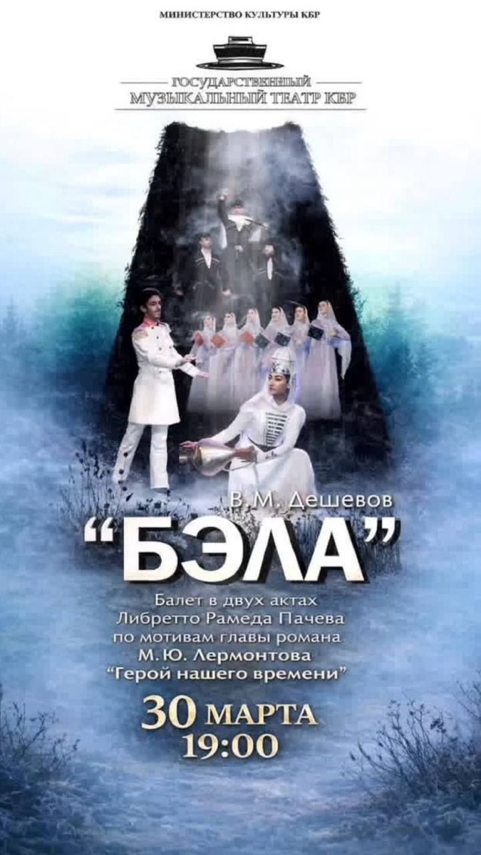 Завтра в 19:00 состоится показ балета «БЭЛА» Балет в двух актах Либретто Рамеда Пачева по мотивам романа М. Ю. Лермонтова «Герой нашего времени» 📍Государственный музыкальный театр 30 марта 19:00