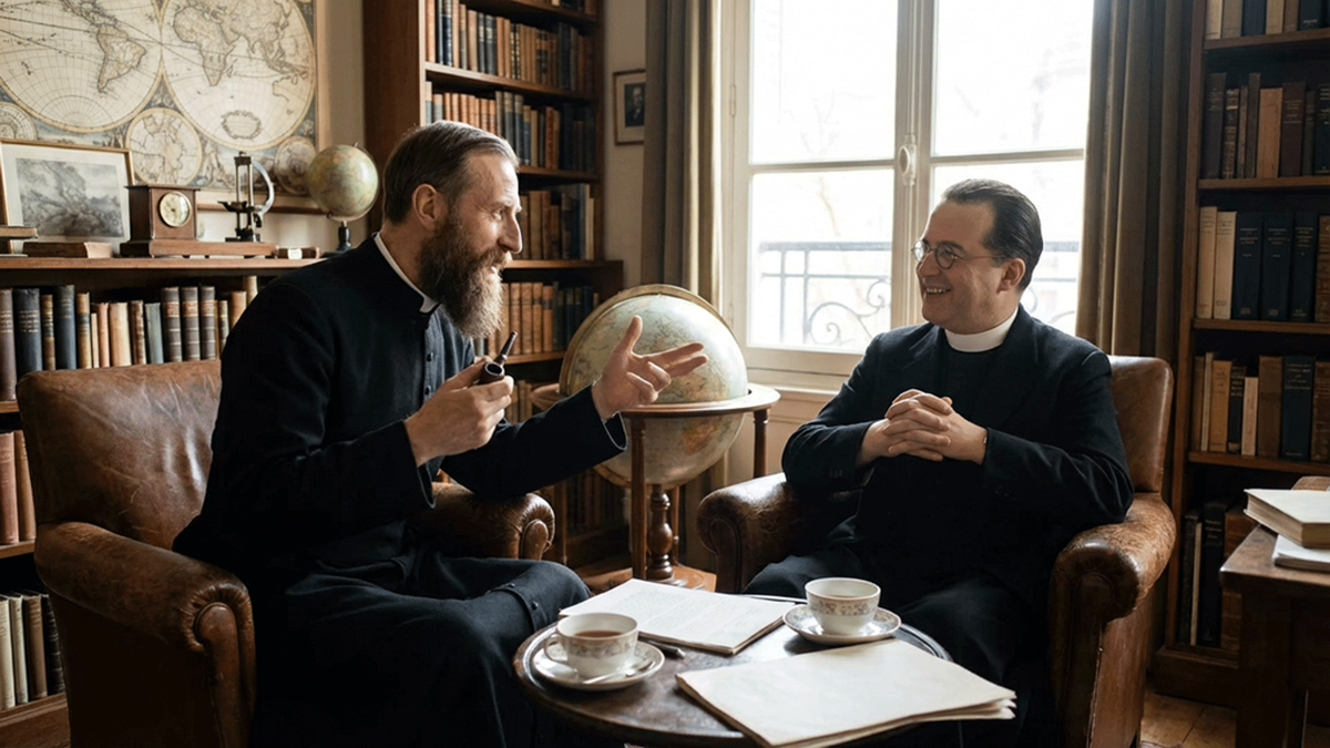 Эти двое никогда не встретятся. Леметр — тихий бельгийский аббат без ордена и цензоров. Тейяр — блестящий иезуит в позолоченной клетке. Один опровергает Эйнштейна уравнениями. Другой в ссылке переписывает смысл эволюции. Оба — католические священники. Оба — первоклассные учёные. И оба в один и тот же момент истории думают об одном и том же вопросе: как устроена вселенная — и что это говорит о её Авторе.