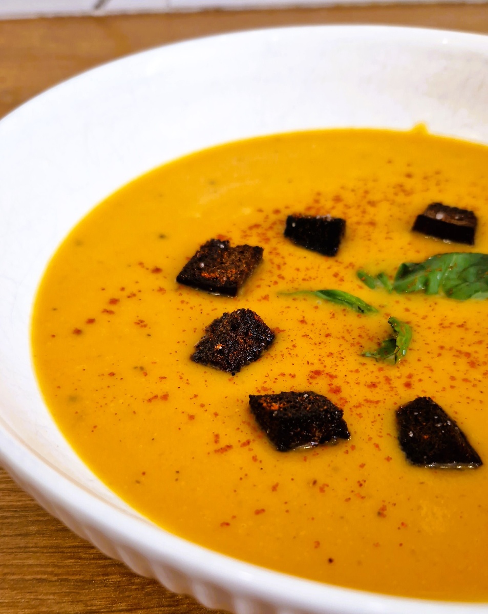 - Разливаем, украшаем сухариками, листьями базилика и копченной паприкой (также можете просто поперчить или добавить, например, корицу. Все на ваш вкус).
