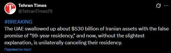 ОАЭ аннулировали ВНЖ всем гражданам Ирана, в том числе "золотые" и присвоили их активы. "ОАЭ присвоили иранские активы на сумму около 530 миллиардов долларов, обманув их обещанием «99-летнего вида на жительство», а теперь, без малейшего объяснения, в одностороннем порядке их аннулируют", — пишет иранское издание. Заря | Новости - Подписаться
