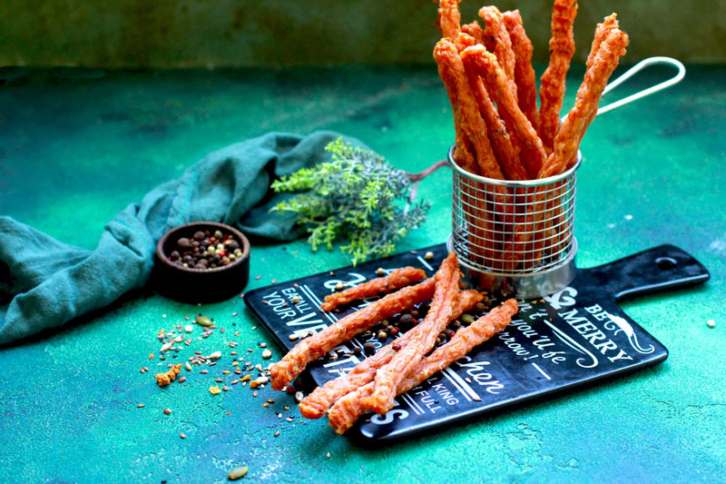 Тонкие колбаски из нежирного мяса, запакованные порционного в вакуум, можно хранить даже вне холодильника. Колбаски можно готовить в дегидраторе, в духовке с конвекцией, в некоторых моделях аэрогриля. ✔ Куриное филе – 1 кг; ✔ Соль – 15 г ; Специи по вкусу: ✔ Коньяк (или вода) – 60 мл; ✔ Сухой чеснок – 2 ч. л.; ✔ Паприка сладкая (вкуснее копченая) – 2 ч. л.; ✔ Перец черный – 1 ч. л. Мясо должно быть без жира. Можно также взять постную говядину или свинину. Колбаски из куриного фарша более нежные, из говяжьего – самые жёсткие. Смолоть филе в фарш, добавить все специи, влить коньяк (или воду), фарш очень хорошо выбить, чтоб разбить все волокна и сделать фарш пышным. Если у вас есть планетарный миксер или тестомес, можно выбить фарш спиральной насадкой для теста 10-15 минут. Выбитый фарш поставить в холодильник на 10 часов. Фарш поместить в кондитерский мешок с насадкой 1 см (или просто обрезать мешок с краю). Отсадить фарш на поддоны дегидратора (или застелить противни бумагой для выпечки