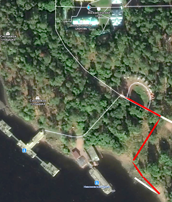 В предыдущей статье у нас состоялась короткая прогулка по берегу Большой Никоновской бухты в восточном направлении от причала. Сегодня мы поднимемся от берега к Главной Монастырской дороге, рядом с которой в 2022 году был установлен Поклонный крест. Поднимаясь по склону берега, полюбуемся видом на восточную часть бухты. У берега устроена зона для шашлыков: стол, скамейки, мангал. Чуть выше проходит дорожка, ведущая к кафе «Форель». От берега, недалеко от полуразрушенной лодки (соймы), о которой я рассказал в предыдущей заметке, начинается лестница, ведущая к Главной Монастырской дороге. Кстати, Яндекс Карты «немного» устарели: на ней нет лодочного причала, лестницы и, главное, не указано место установки Поклонного креста (хотя на панорамах есть). Наверху лестница заканчивается смотровой площадкой. Ступеньки справа ведут в кафе «Форель». Вправо от смотровой площадки дорога уходит к Гефсиманскому скиту и далее – к Валаамскому монастырю. Вид на бухту от площадки. Слева от площадки находит