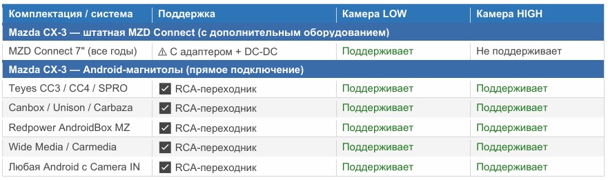 На Mazda CX-3 2014–2018 штатная система MZD Connect использует нестандартное напряжение питания для камеры — 6V. Важно: ГУ подаёт 6V на линию камеры только в двух случаях: при включении заднего хода (R) и в момент загрузки системы (опрос оборудования при старте).
