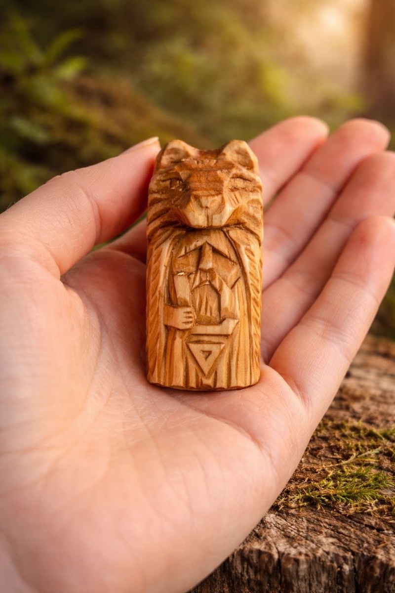 Представляю крошечных кумиров Велеса, вырезанных из липы. Росточек всего 6-7 см, но сколько в них мощи! Образ — в медвежьей шкуре, с медвежьей головой, в руке — посох. Это Велес в его ипостаси хозяина леса, звериного бога, покровителя силы и мудрости природы. Медведь — священный зверь Велеса, символ плодородия, здоровья и власти. В народе говорили: «Велес сам медведем оборачивается, чтобы по лесу ходить да за порядком смотреть». Несмотря на малый размер, каждый такой кумир — полноценный оберег. Его удобно брать с собой, положить в рюкзак, поставить на алтарь или в машину. Маленькие, но могучие. Для тех, кому важна связь с природой и силой предков. #Велес #Миниатюра #РезьбаПоДереву #МедвежьяСила #Кумир #Оберег #РучнаяРабота #Липа #СлавянскаяМифология