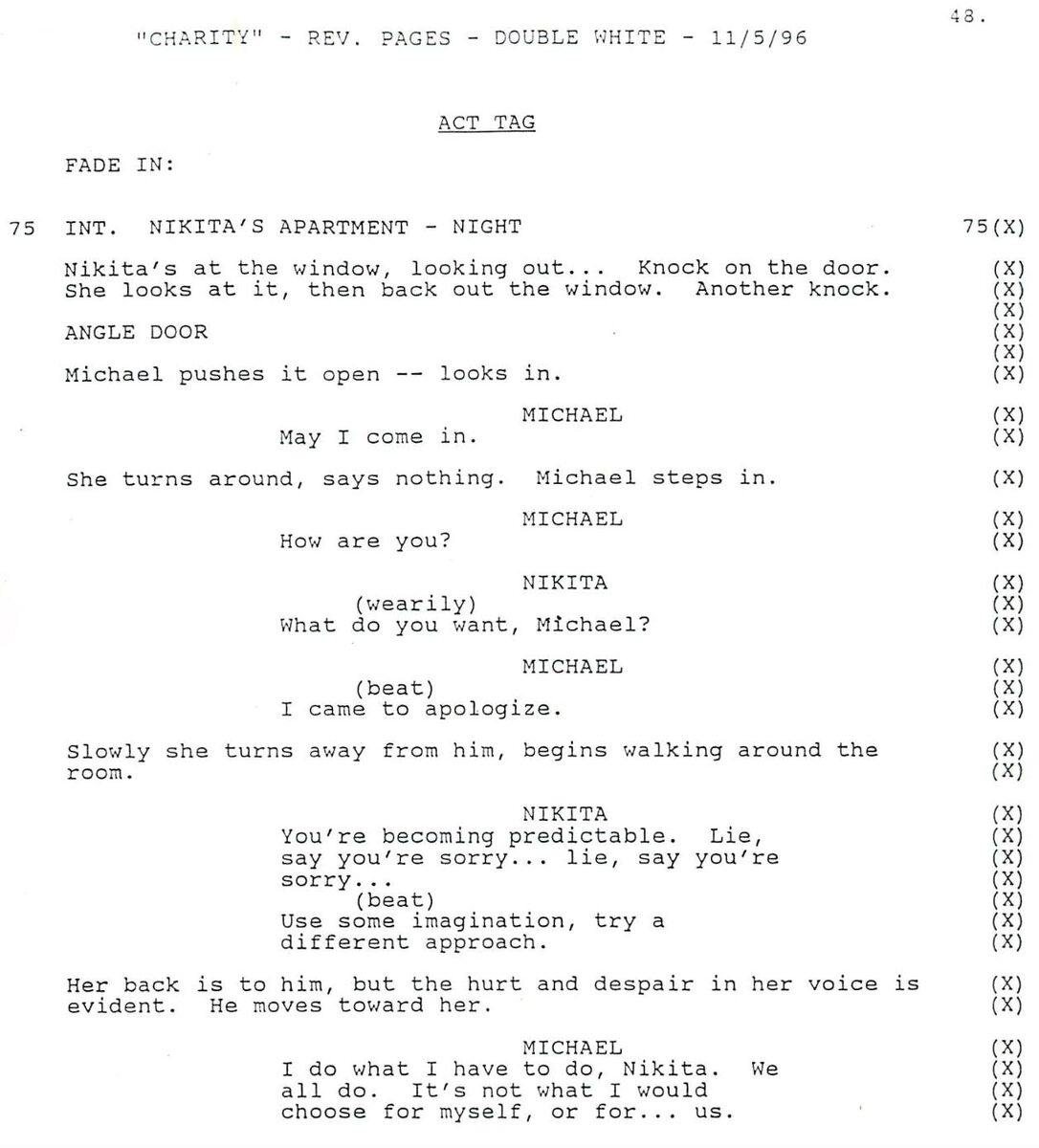 Нашла отрывок из сценария к серии «Благотворительность» (Charity). Оказывается, финал серии задумывался другим! ИНТ. КВАРТИРА НИКИТЫ - НОЧЬ Никита у окна, смотрит на улицу... Стук в дверь. Она смотрит на дверь, затем снова в окно. Ещё один стук. РАКУРС НА ДВЕРЬ. Майкл толкает её и заглядывает внутрь. МАЙКЛ: Можно войти? Она оборачивается и ничего не говорит. Майкл заходит. МАЙКЛ: Как ты? НИКИТА (устало): Что тебе нужно, Майкл? МАЙКЛ (после паузы): Я пришёл извиниться. Она медленно отворачивается от него и начинает ходить по комнате. НИКИТА: Ты становишься предсказуемым. Солжёшь, а потом извинишься... Солжёшь — извинишься. (пауза) Включи воображение, попробуй другой подход. Она стоит к нему спиной, но боль и отчаяние в её голосе очевидны. Он подходит к ней. МАЙКЛ: Я делаю то, что должен, Никита. Как и все мы. Я бы не выбрал такого для себя или для... нас. НИКИТА (цинично): Для нас... (пауза). Ответишь мне на вопрос? Он приближается к ней ещё на шаг. МАЙКЛ: Если смогу. Она отворачивается