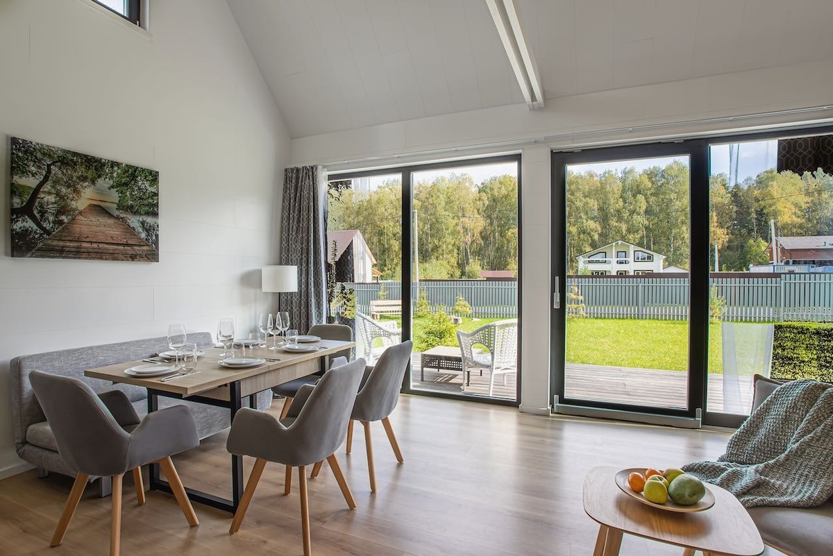 - Просторную кухню-гостиную со «вторым светом» и панорамным остеклением, создающую объем, визуально превосходящий залы в больших коттеджах.