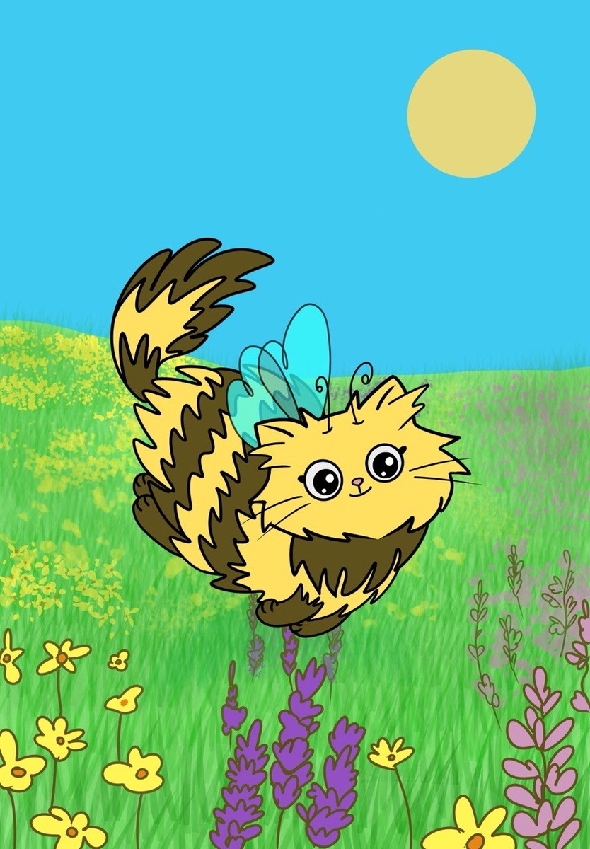 На солнечном лугу жила Киса-Пчёлка, которая больше всего на свете любила летать. У неё были прозрачные крылышки, пушистые щёчки и забавная полосатая спинка. Когда она радостно жужжала, её животик смешно покачивался, и она звонко напевала: — Мяу-вжжжу! Мяу-вжжжу! Над цветочками кружу! Каждый день она и другие Кисы-Пчёлки отправлялись на цветочную поляну, чтобы помогать растениям, перенося пыльцу с одного цветка на другой. Однажды во время полёта над травами она заметила впереди невероятно красивый цветок. Он сиял, словно маленький костёр: у него были яркие алые лепестки и пушистая серединка, а пах он так сладко, что Киса-Пчёлка заулыбалась прямо на лету. — Ого! Вот это находка! — обрадовалась она и аккуратно приземлилась на один из лепестков. Киса-Пчёлка принялась собирать пыльцу. Всё шло прекрасно, но вдруг неподалёку зашуршали листья — сначала тихо, а затем всё сильнее и сильнее. Неожиданно налетел порывистый ветер: УУУХ! — Ой! — только и успела пискнуть Киса-Пчёлка. Ветер подхватил