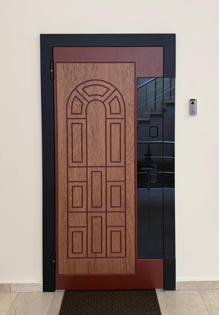 Накладка на дверь из натурального шпона с фрезеровкой — это пример того, как даже привычный элемент интерьера может стать дизайнерским акцентом.