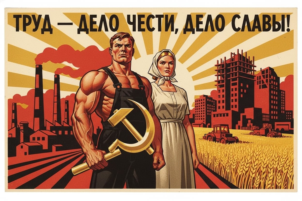 От участника конкурса Открытка в стиле агитационного плаката 1930‑х годов. На переднем плане — рабочий и колхозница, держащие серп и молот. На заднем плане — заводы, поля с колосьями, строящиеся дома. Вверху лозунг: «Труд — дело чести, дело славы!». Стиль — героический реализм, крупные формы, контрастные цвета (красный, чёрный, золотой). Чёткие контуры, минимализм в деталях, акцент на символах эпохи. Соотношение сторон 3:2. Сгенерировать без лишних мучений можно в веб агрегаторе нейросетей gptunnel(промокод на скидку 75% PROMPT1_75 ) или телеграм боте Syntx Еще у нас есть группа VK и сайт-каталог промптов https://prompt1.ru/ #ссср@prompt1_ru #ретро@prompt1_ru
