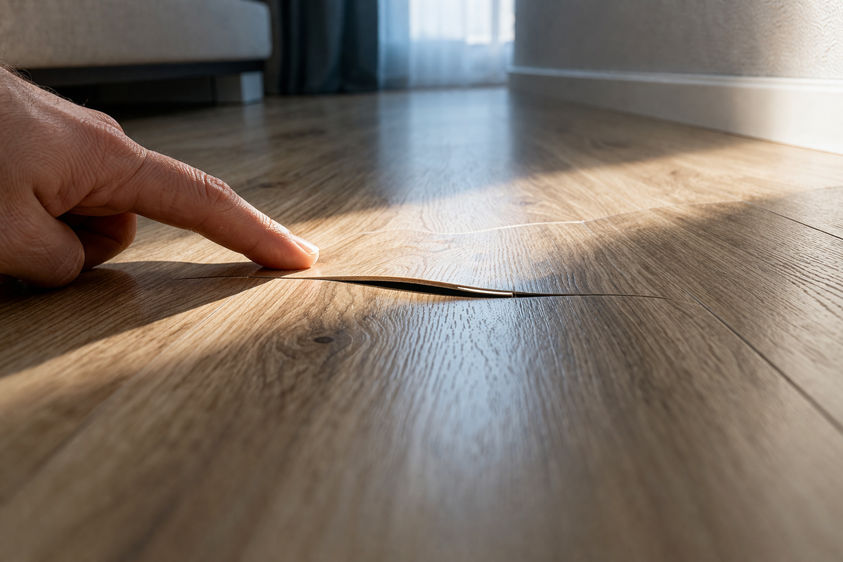 И вот этот микродвижение дает звук. Сам ламинат не ломается, но начинает «играть» именно в этой зоне. Основная причина неровное основание или ошибка укладки