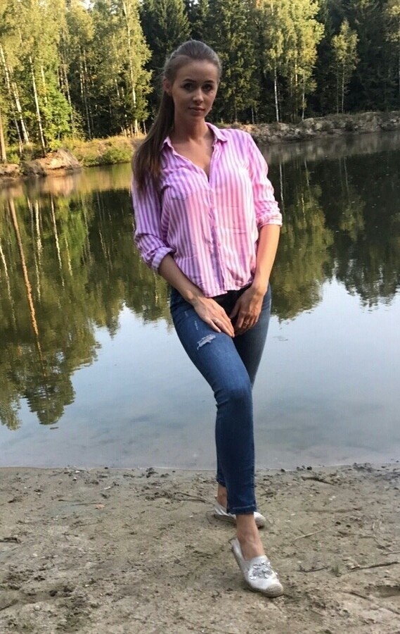На ней розовая рубашка в тонкую полоску, небрежно расстёгнутая у ворота, — словно случайный штрих, добавляющий образу живости. Рукава закатаны до локтей, обнажая тонкие запястья, что придаёт её виду лёгкую небрежность, будто она только что наслаждалась прогулкой по лесной тропинке. Синие джинсы, слегка потёртые на колене, подчёркивают её естественность и свободу от условностей. На ногах — светлые мокасины, будто созданные для неспешных прогулок у воды.