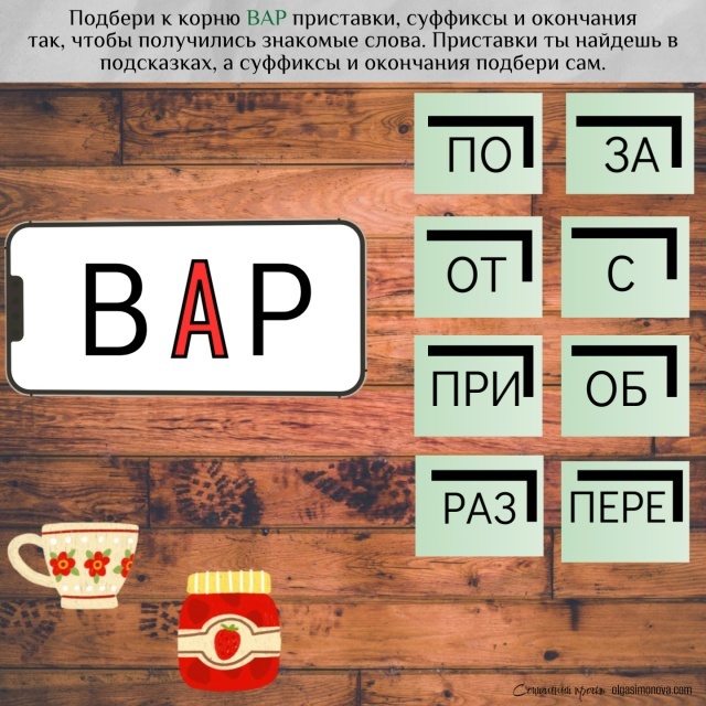 Задание можно сформулировать таким образом, чтобы ученик присоединил к корню ВАР предложенные приставки. Вторым шагом можно предложить: ..."к получившимся словам придумай суффиксы и окончания".