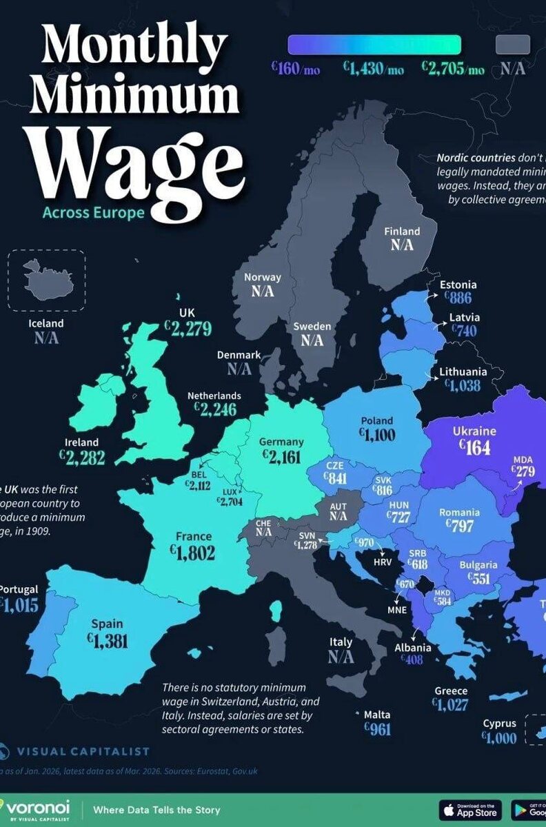 Согласно свежим данным мониторинга доходов, Украина заняла последнюю строчку в рейтинге европейских стран по уровню минимальной заработной платы. На сегодняшний день этот показатель составляет всего €164 в месяц. Для сравнения, лидерами списка стали Ирландия, Великобритания и Нидерланды. В этих государствах установленный государством минимум в 14 раз превышает украинский. Сайт "Другая Украина" / Telegram / Вконтакте / Центр поддержки Украинцев "Другая Украина" теперь в МАХ