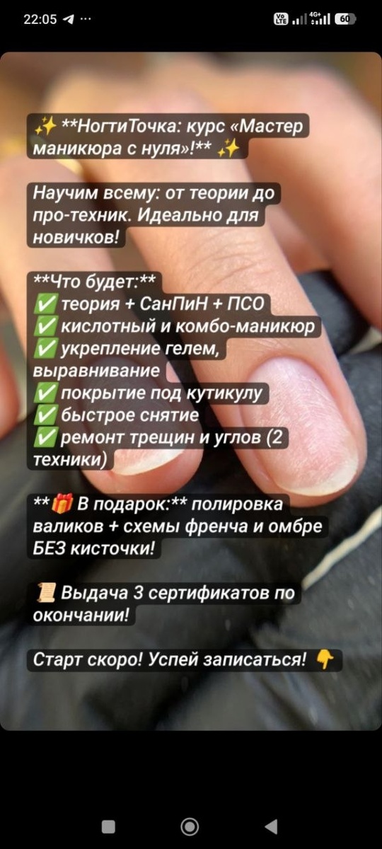 ! Хочешь научиться пилить ноготочки и разобраться в профессии? Мы поможем! Мы дадим тебе всё для отличного старта: поставим руку, раскроем профессиональные секреты и выдадим сертификат — официально подтверждаем твои навыки! Что ты получишь: * Теорию: строение ногтей, основы материалов и инструментов, разбор заболеваний (научимся не бояться сложных случаев!). * СанПиН: освоишь санитарные нормы и проведёшь ПСО вместе с мастером. * Практику по техникам: * кислотный и комбинированный маникюр; * укрепление гелем (салонный уровень); * выравнивание ногтевой пластины; * покрытие под кутикулу; * быстрое и безопасное снятие материала (рабочая схема!). * Ремонт: 2 техники ремонта трещин и углов — будешь спасать даже самые капризные ногти. БОНУСЫ — в подарок: * полировка валиков; * схемы выполнения френча и омбре *без кисточки* — легко и быстро! По окончании курса — выдача 3 сертификатов! Старт уже скоро! Записывайся прямо сейчас — количество мест ограничено! 📞 Звони: +79262706042 Уже ест