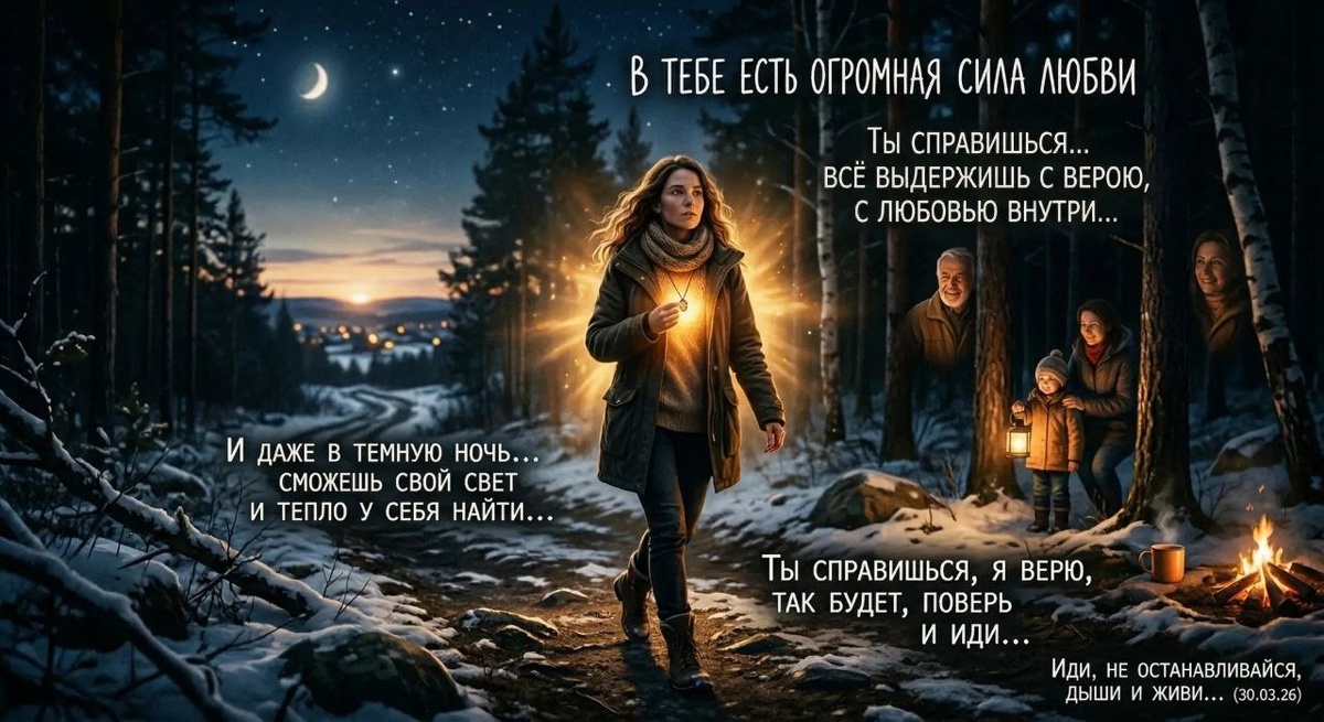 Ты справишься со всеми, что у тебя на пути... Я верю, ты справишься... Все тяжести и все перепетии судьбы пройдешь, все выдержишь ты с верою, с любовью там, глубоко у себя внутри... И даже в самую темную ночь, даже в самую стужу души ты сможешь свой свет и тепло у себя найти, увидеть их свет в отраженьи пути и в лицах людей у себя на пути, да в мелочах ежедневных найти .. Все это поддержка твоя на пути... Ты справишься, я верю, так будет, поверь и иди... Вперёд иди, в темпе своём, как ты можешь, но с верой, с любовью внутри... Иди, не останавливайся, дыши и живи...(30.03.26)