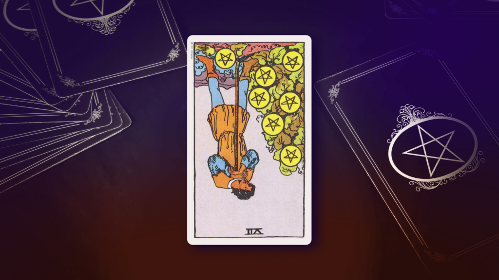 Перевёрнутая Семёрка Пентаклей указывает на ошибки в финансовой стратегии или разочарование в работе. Возможна ситуация, когда вложения не окупаются или ресурсы расходуются неэффективно.