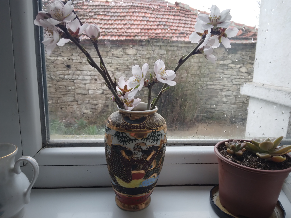 Вчера занималась обрезкой сада. Зацвел миндаль, на подходе абрикосовые деревья. Принесла домой несколько веточек миндаля и поставила в японскую вазочку. Обычно миндаль зацветает в середине марта, нынче откровенно припозднился.
