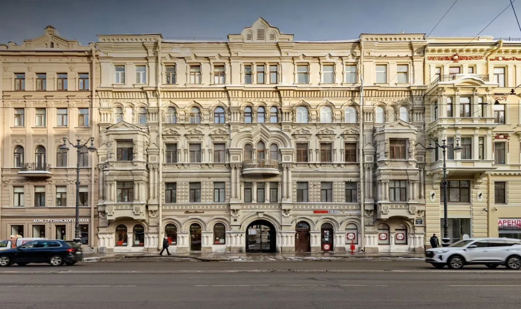Невский проспект, 168. Доходный дом купца Александра Николаева, построен в 1880 году гражданским инженером Климовым в стиле поздней эклектики. Фасад — один из самых нарядных на этом отрезке Невского: богатая лепнина, арочный въезд во двор, всё при себе. Сам Николаев, что забавно, торговал паркетом — и паркет в доме, к слову, до сих пор есть. В 1898 году архитектор Курзанов надстроил здание и объединил его с соседним домом по Конной улице. Дом имеет статус выявленного объекта культурного наследия, фасад недавно реставрировали — и это видно.