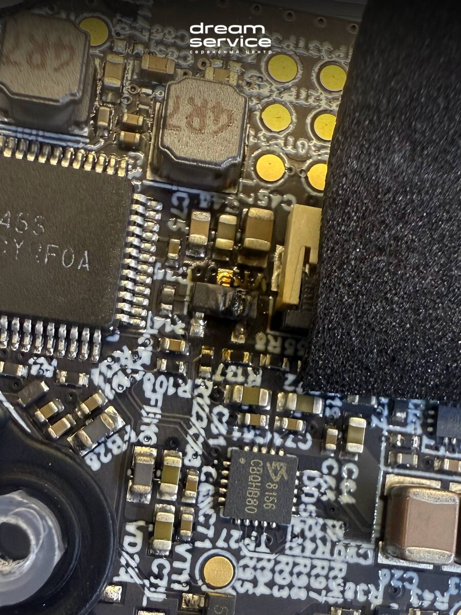 Яндекс Станция Мини перестала реагировать на всё. Индикатор не светится, Алиса молчит, кнопки не отвечают. Хозяйка решила, что устройство просто умерло. Но сначала принесла к нам — на всякий случай. Когда мы вскрыли корпус, стало понятно: причина конкретная, и её можно устранить. Умные колонки — это полноценные электронные устройства с процессором, памятью и платой управления питанием. Последняя — одно из уязвимых мест при нестабильном напряжении в сети. При диагностике обнаружили: в цепи питания выгорел один из элементов. Буквально: следы термического повреждения на плате, компонент разрушен. Это классическая картина после скачка напряжения — резкого превышения нормального уровня в сети. Происходит чаще, чем кажется: при включении мощных приборов в одну розетку, при восстановлении электроснабжения после отключения, при грозе. Миронов Д.С., 9 лет в ремонте: «Скачки напряжения убивают электронику одинаково — неважно, телефон это, умная колонка или роутер. Защита есть не у каждого устро