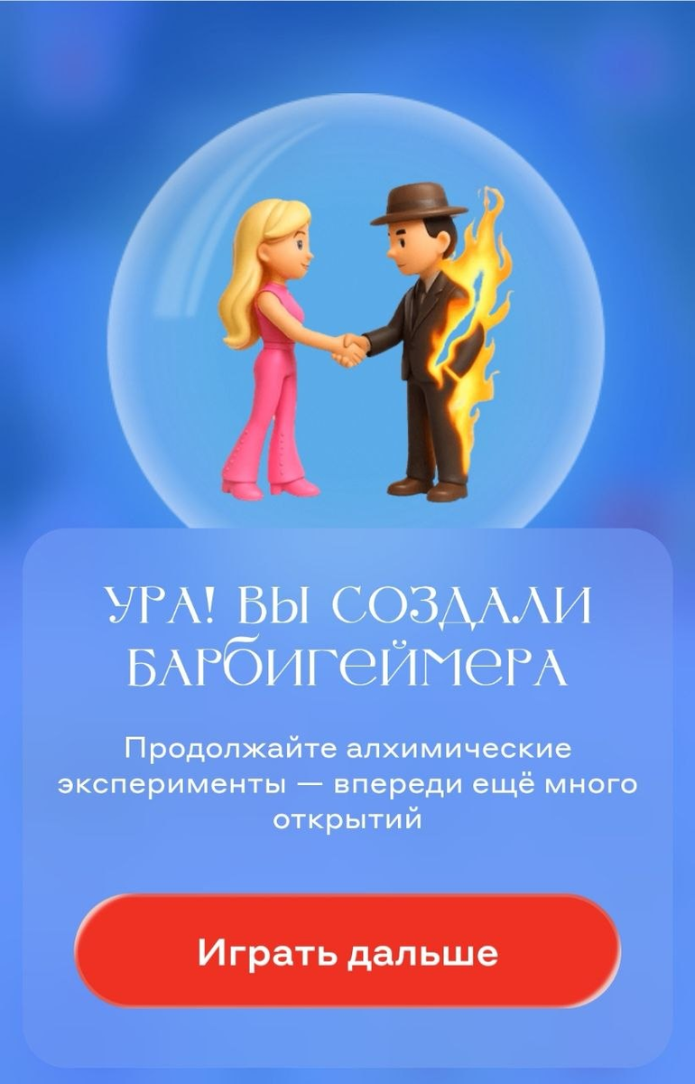 На входе дают: мятная конфета, пепси, песок, игрушка, ребенок, розовое платье (еще бы знать, что такое барбигеймер, в первый раз слышу этот термин) Быстрый способ: Рецепты: 16 элементов: мятная конфета, пепси, песок, игрушка, ребенок, розовое платье, пустыня, девочка, кукла, барби, эксперимент, жасмин, опенгеймер, мария кюри, песочница, барбигеймер Скрины Артефакты 166/191 Все статьи по Алхимии тут: Ссылка на канал в Max Ссылка на канал в ТГ