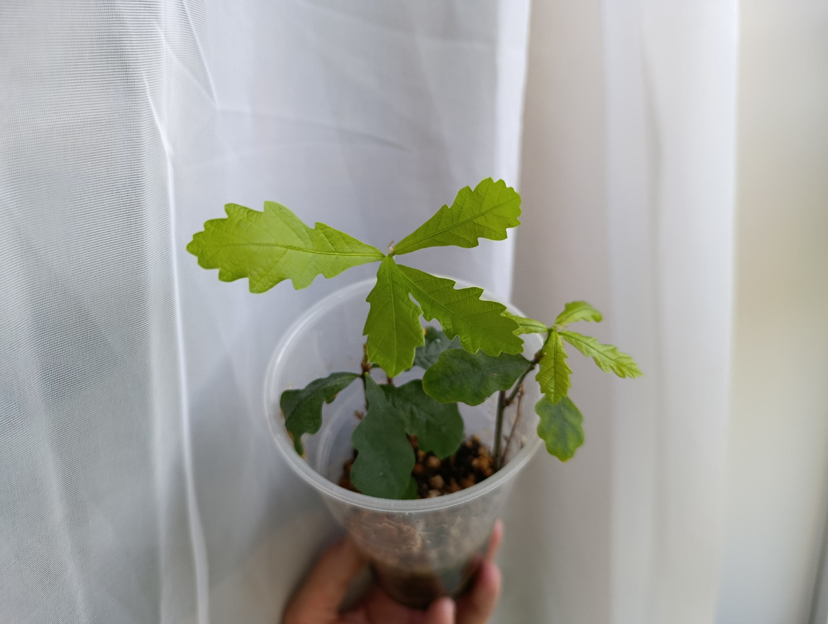 Дерево первое - дуб. Прошлой весной подняла с земли несколько желудей. Беспроигрышный вариант - валяясь под забором, они прошли зимнюю стратификацию и можно было сажать без предварительной подготовки.