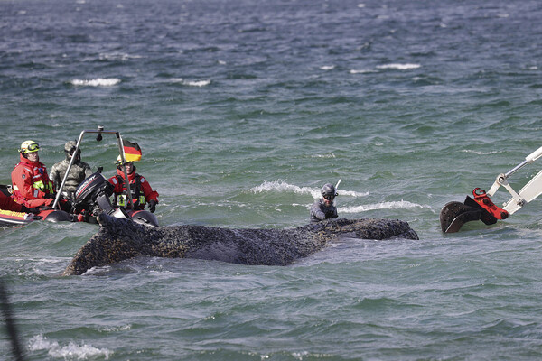 Кит, застрявший на отмели в Балтийском море, ослаб и больше не пытается освободиться