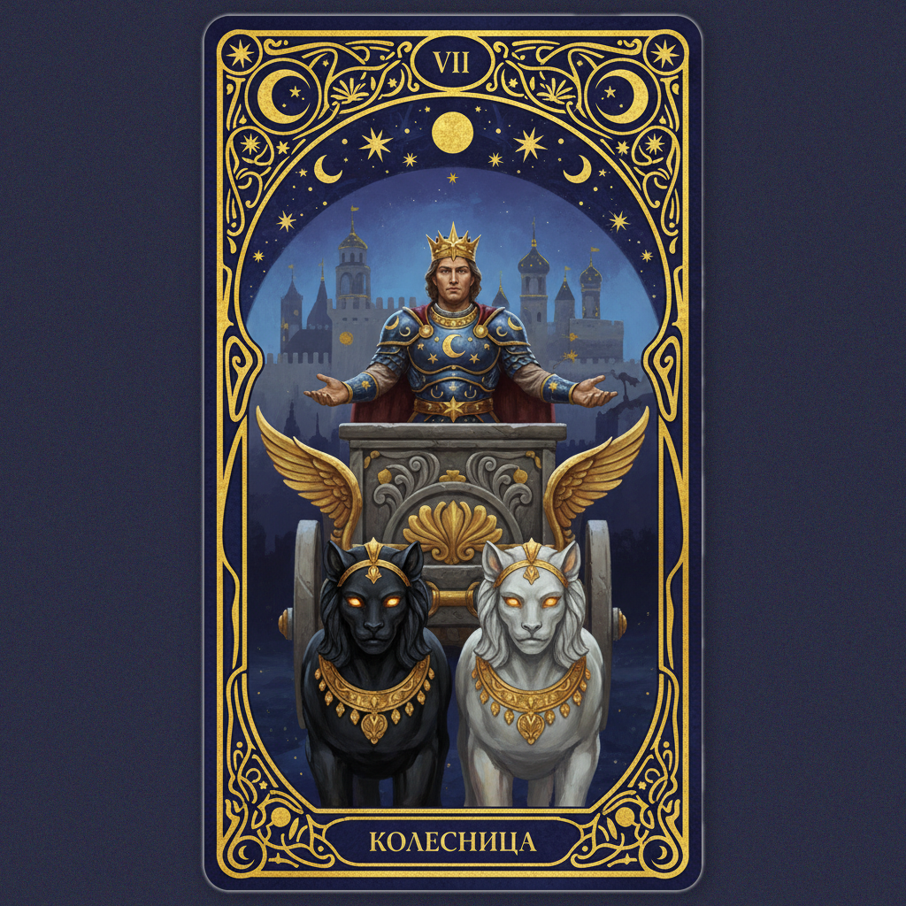 Но именно в этом и весь Рак. За мягким панцирем скрывается колоссальная внутренняя сила. Рак умеет двигаться к цели так, что со стороны вообще непонятно, как он это делает. Тихо, без лишнего шума, иногда бочком — но приходит туда, куда наметил. Колесница как раз про это: не про агрессивный прорыв, а про управление противоречивыми силами (два сфинкса, смотрящие в разные стороны) и движение вперёд за счёт внутреннего контроля.