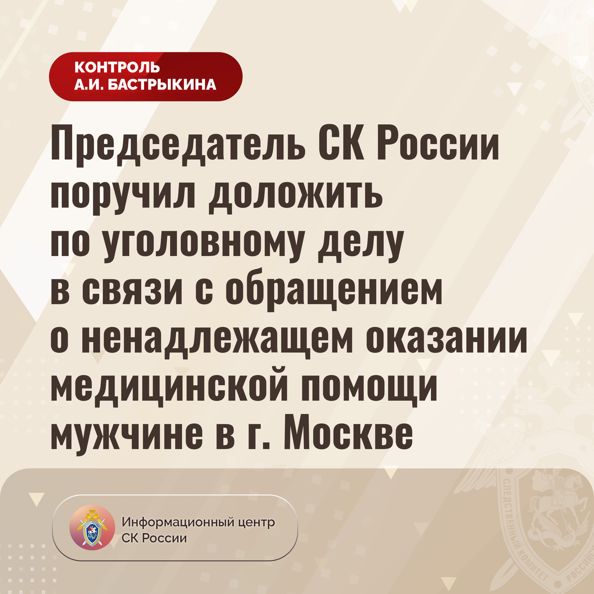 Председатель СК России поручил доложить по уголовному делу в связи с обращением о ненадлежащем оказании медицинской помощи мужчине в г. Москве В приёмную Председателя СК России А.И. Бастрыкина в социальной сети «ВКонтакте» обратилась жительница города Москвы по вопросу ненадлежащего оказания медицинской помощи ее 21-летнему сыну, в результате чего он скончался. В январе текущего года в связи с ухудшением состояния его здоровья женщина дважды вызывала скорую медицинскую помощь. Сотрудники первой бригады отказали в госпитализации, рекомендовав прием лекарственных препаратов. После повторного обращения сын заявительницы был доставлен в больницу, где ему без проведения обследований также отказали в приеме на стационарное лечение и направили под наблюдение в районную поликлинику. Спустя несколько дней молодой человек скончался. Обращения матери в компетентные органы результатов не принесли, никто к ответственности не привлечен. В ГСУ СК России по городу Москве возбуждено уголовное дело. Пр
