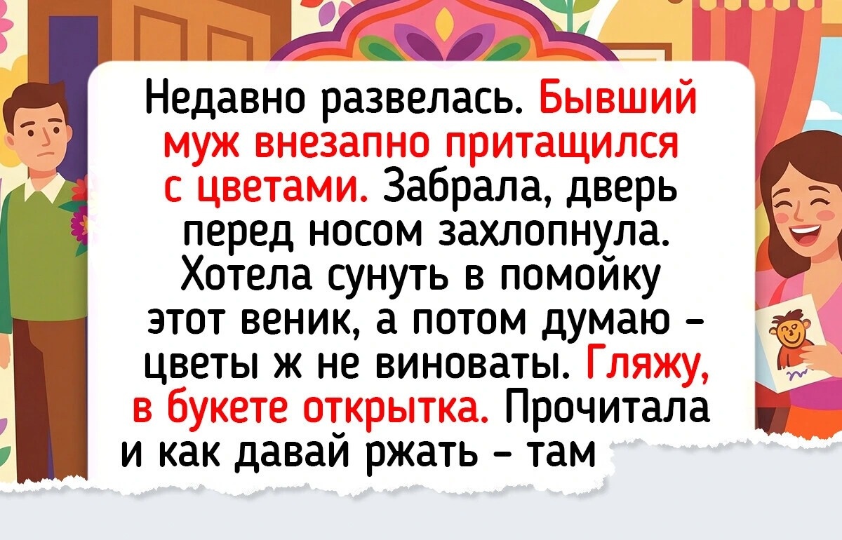 Недавно развелась. Бывший муж внезапно притащился с цветами. Забрала, дверь перед носом захлопнула. Хотела сунуть в помойку этот веник, а потом думаю — цветы ж не виноваты. Гляжу, в букете открытка. Прочитала и как давай ржать — там смиренная просьба: «С 8 марта! Можно мне Playstation забрать? Ты все равно не играешь». © ADME